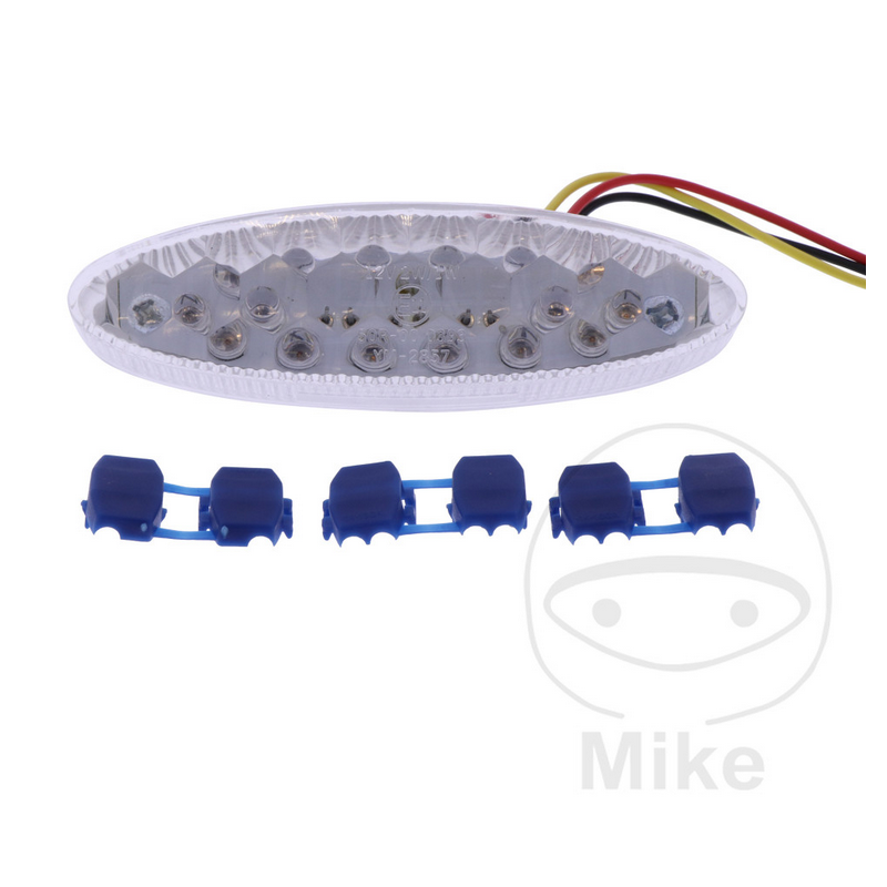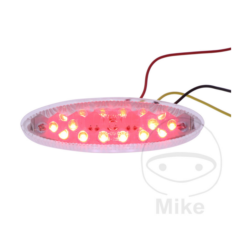Taga, piduri- ja numbrituli. E-tüübikinnitus. Klaas punane. Mõõdud 30x107x32mm. Kinnituste vahekaugus 96mm.